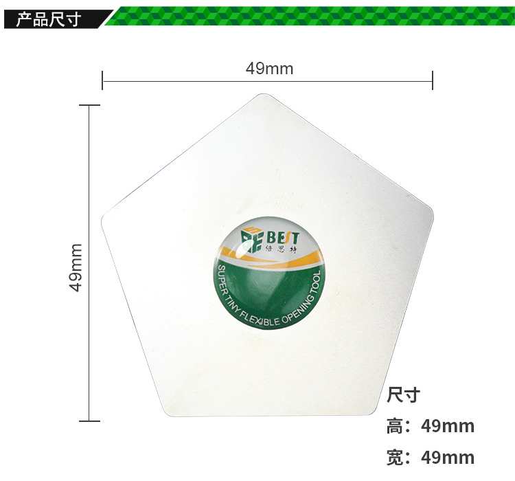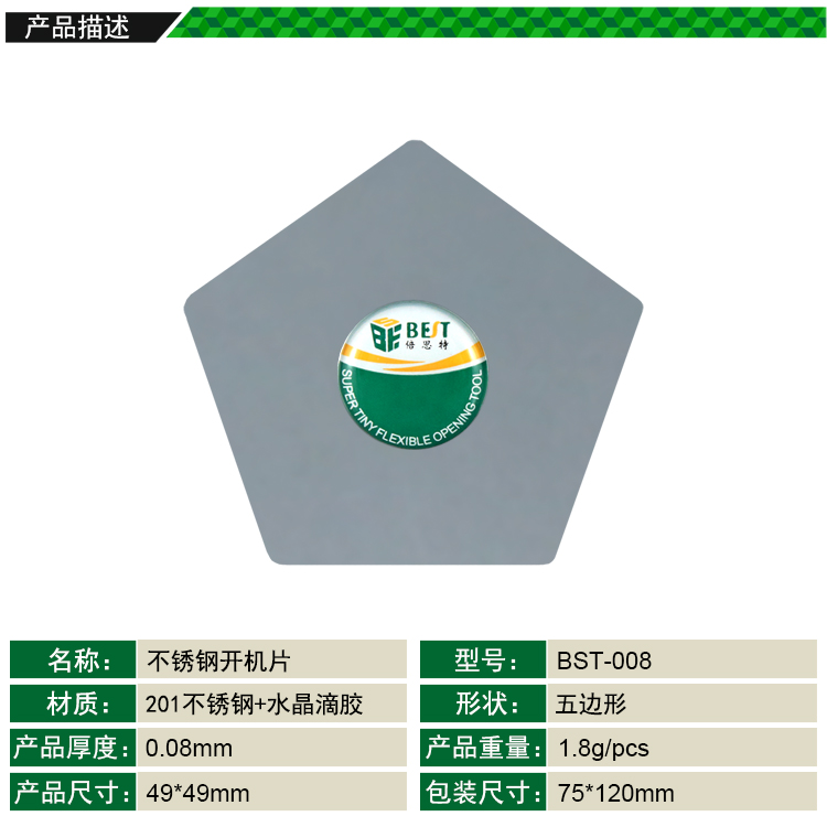 ? 产品名称: 不锈钢开机片(五边形)? 产品型号: BST-008? 产品类别: 撬棒撬片系列