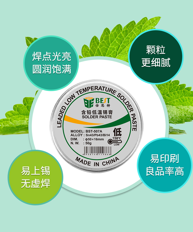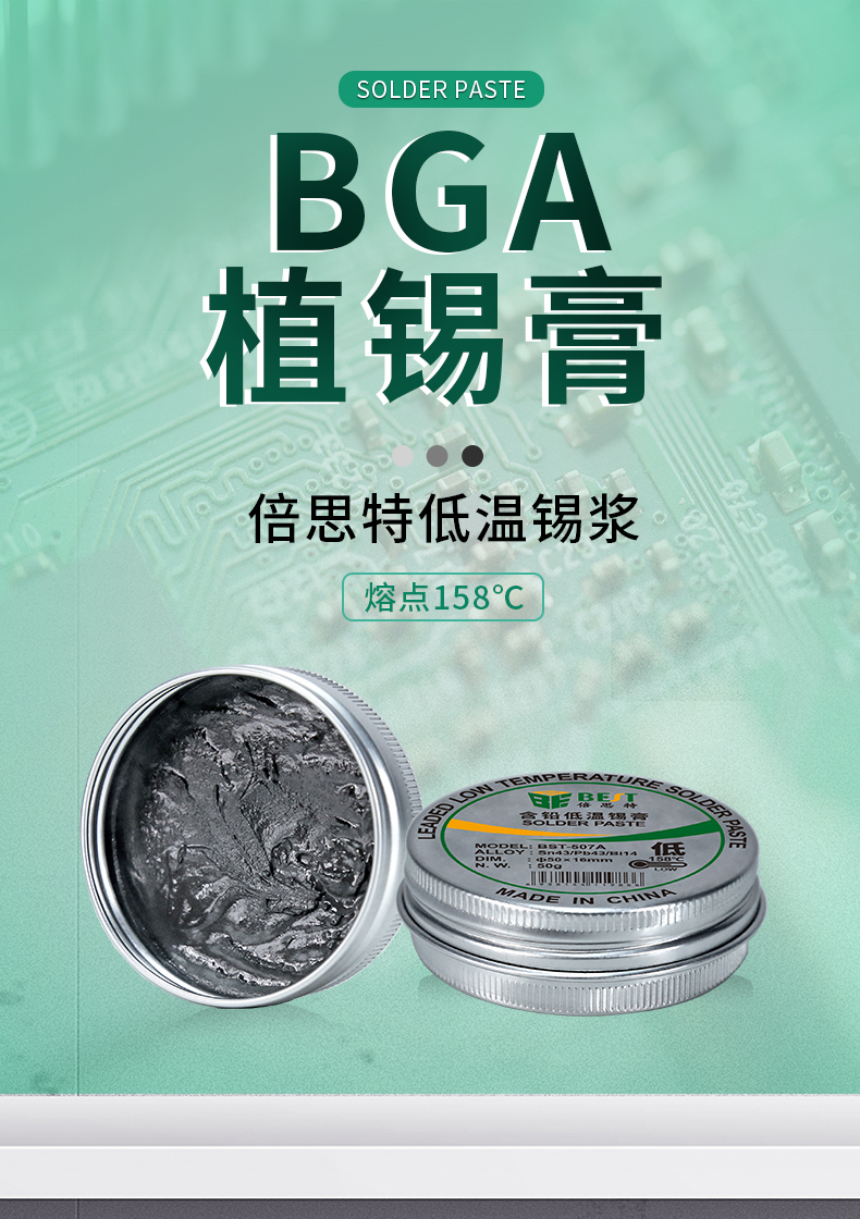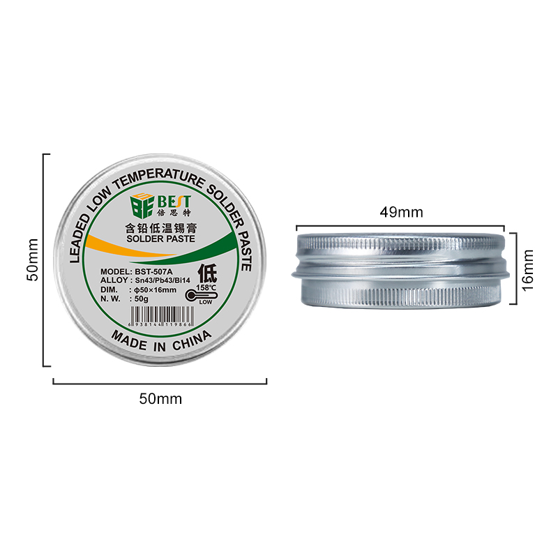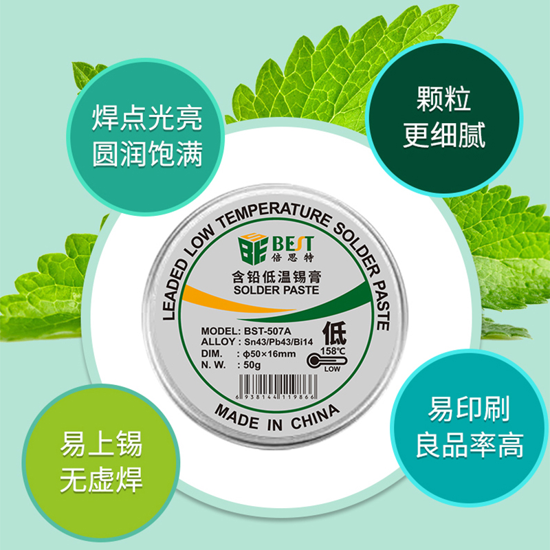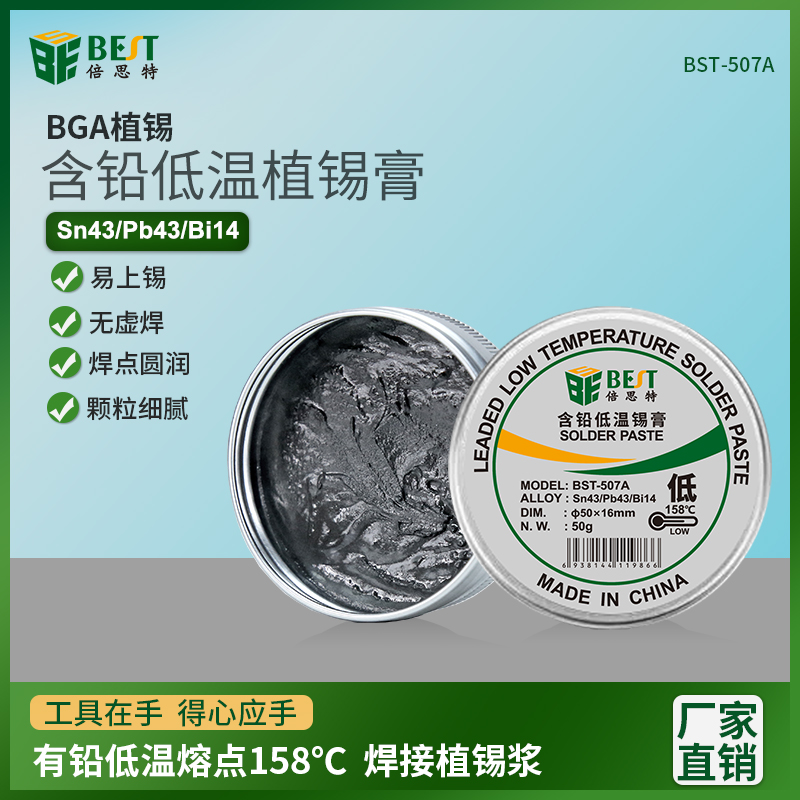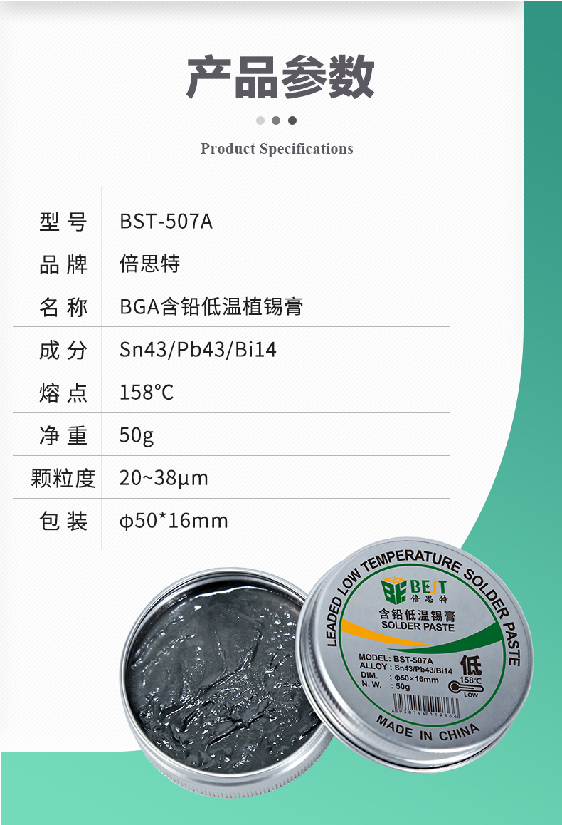 返回当前位置: 首页 / 产品中心 / BST-507A 含铅低温锡膏 Sn43/Pb43/Bi14 铝罐BGA植锡膏50g