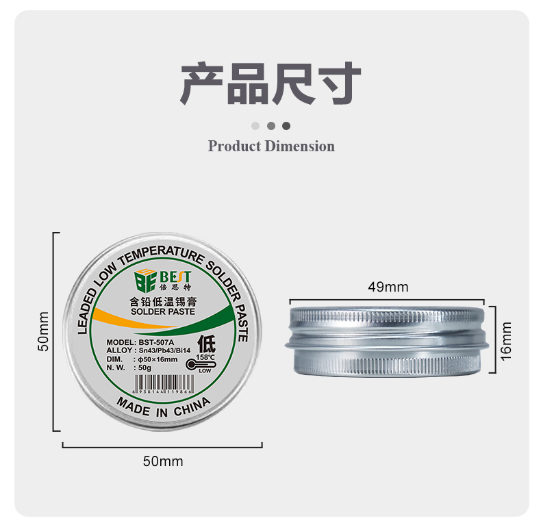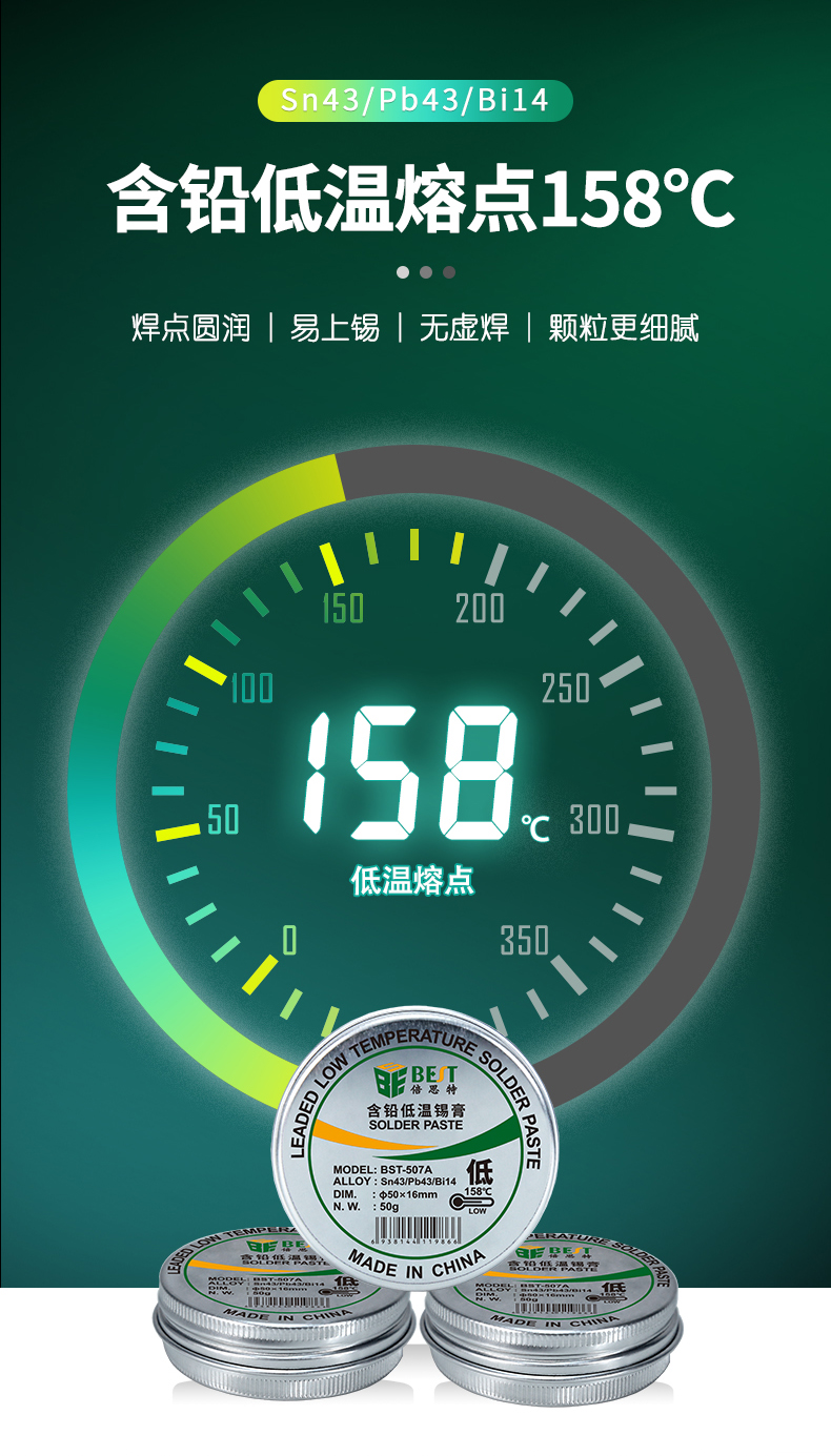 ? 产品名称: 含铅低温锡膏? 产品型号: BST-507A? 产品类别: 锡浆焊油系列? 产品成分: Sn43/Pb43/Bi14? 产品重量: 50g