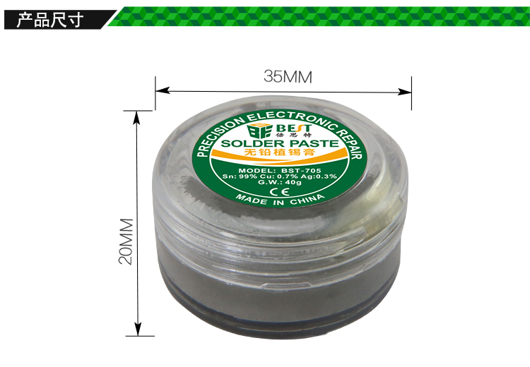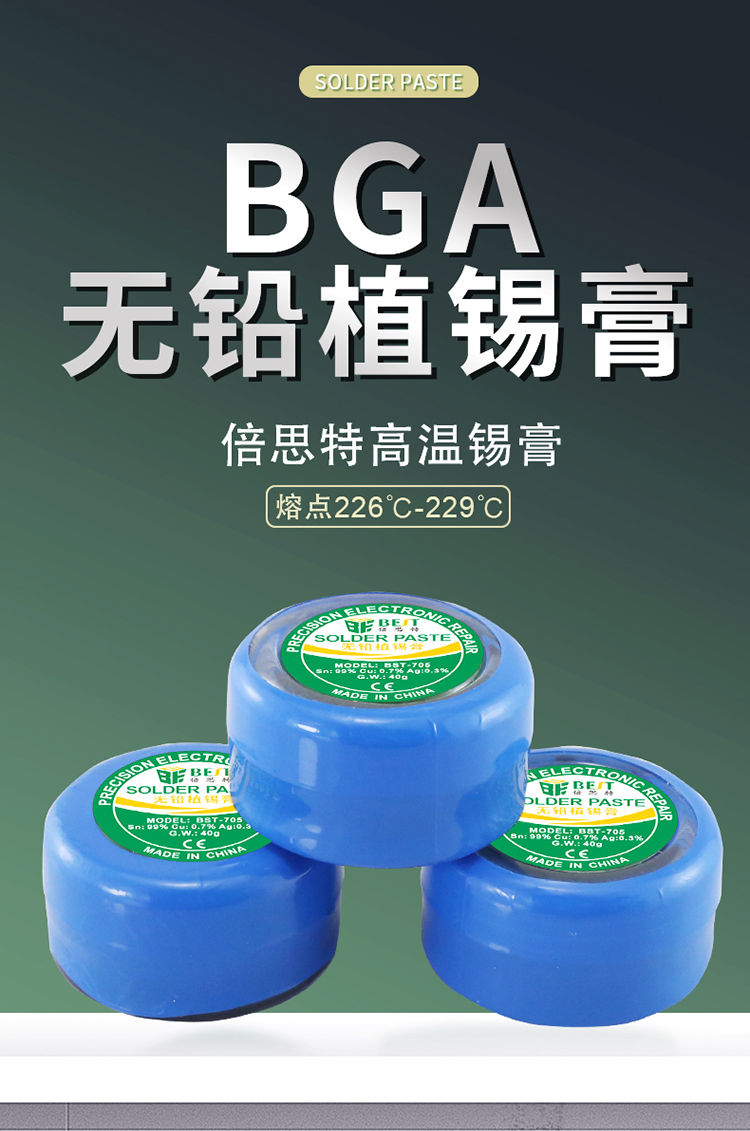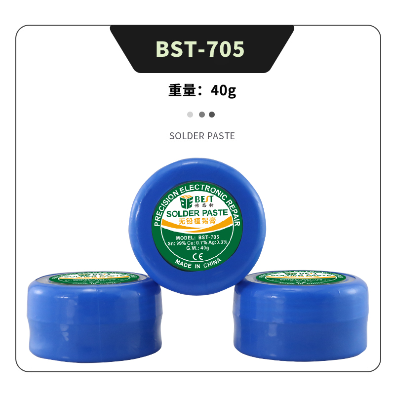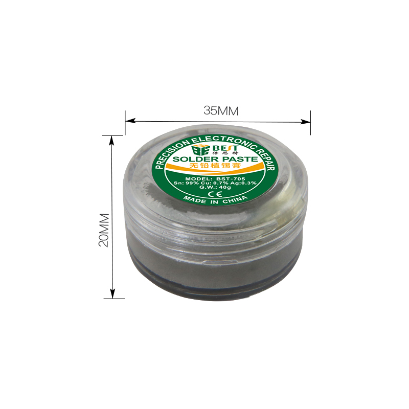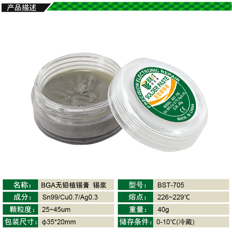 ? 产品名称: 无铅锡浆 BGA植锡膏40g? 产品型号: BST-705? 产品类别: 锡浆焊油系列