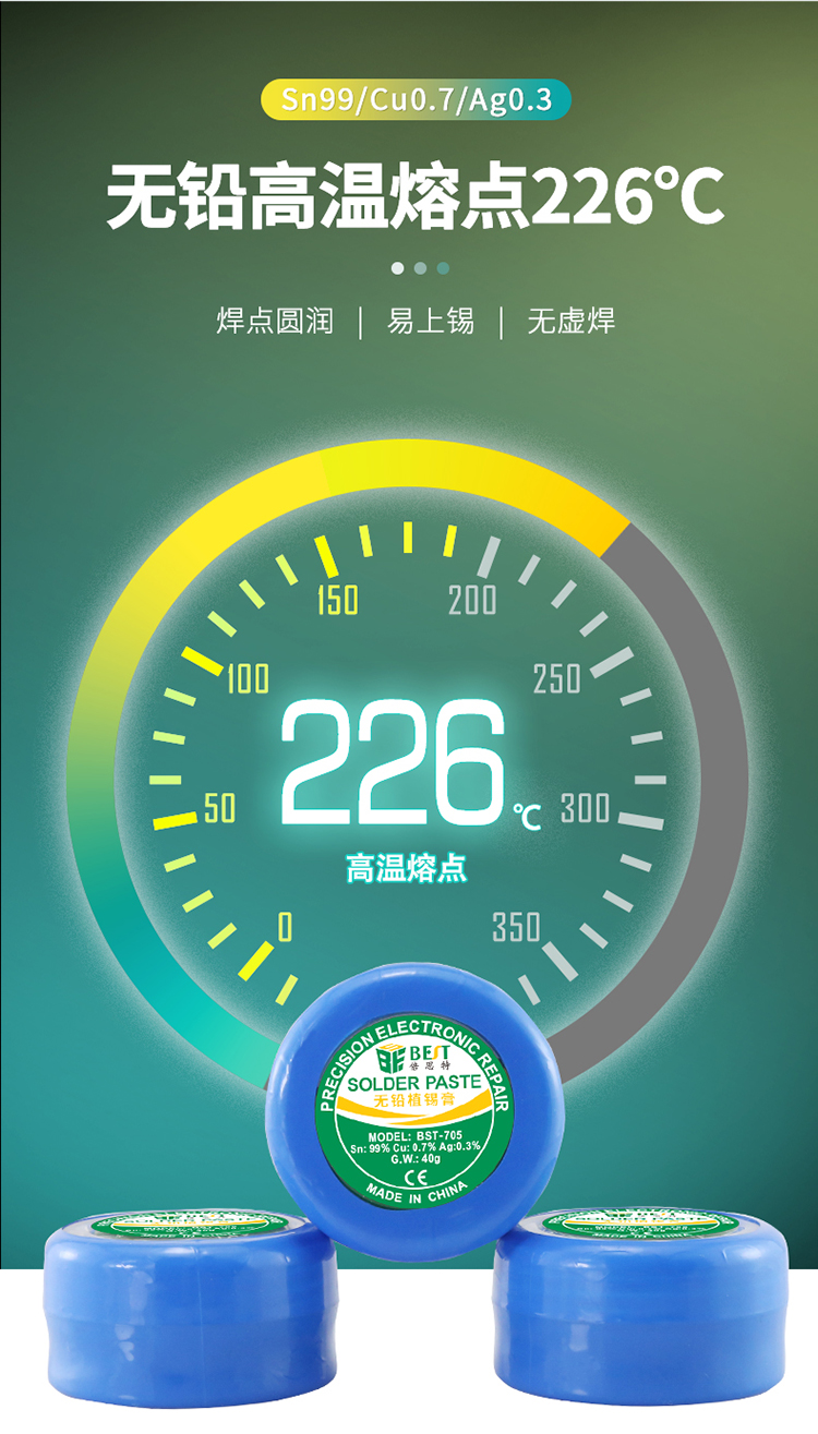 返回当前位置: 首页 / 产品中心 / BST-705 无铅锡浆 高温锡浆 焊锡膏 BGA植锡膏 Sn99/Cu0.7/Ag0.3 40g