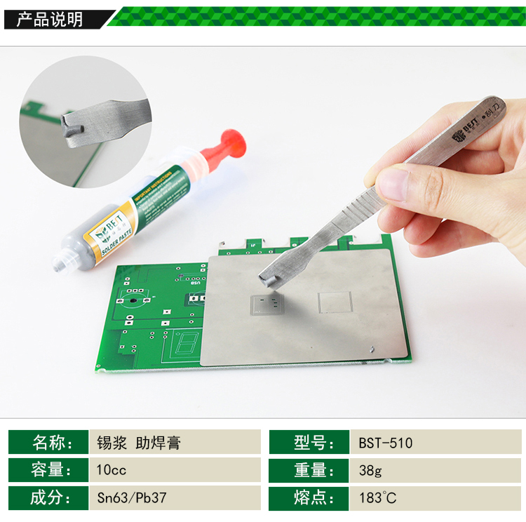 ? 产品名称: 针筒式锡浆? 产品型号: BST-510? 产品类别: 锡浆焊油系列