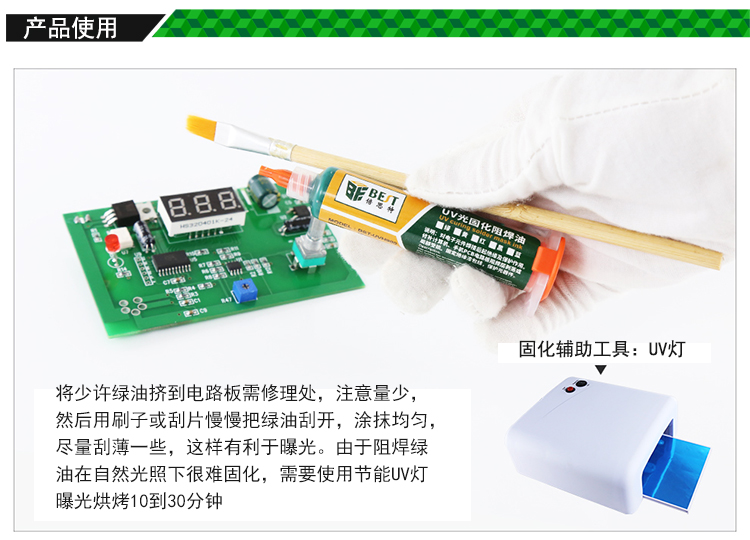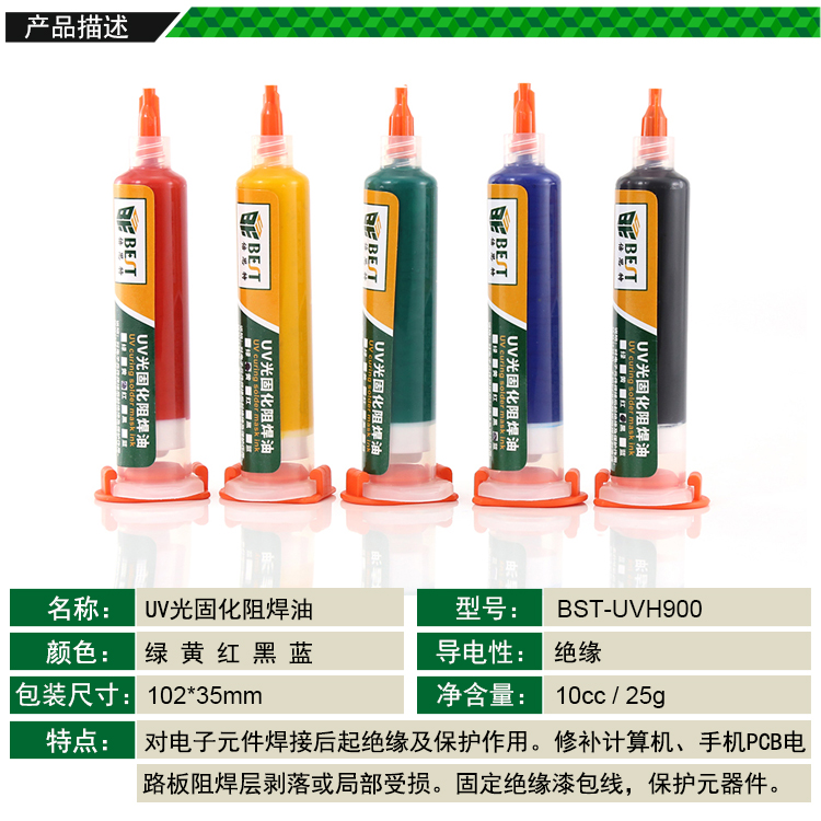 返回当前位置: 首页 / 产品中心 / BST-UVH900 UV光固化阻焊油 绿油 红油 黄油 蓝油 黑油 UV固化紫外光阻焊油PCB板绿油黄油专用保护漆25g/10cc