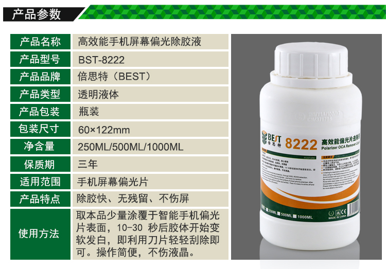 ? 产品名称: 高效能偏光片去除液? 产品型号: BST-8222? 产品类别: 清洁剂辅料系列