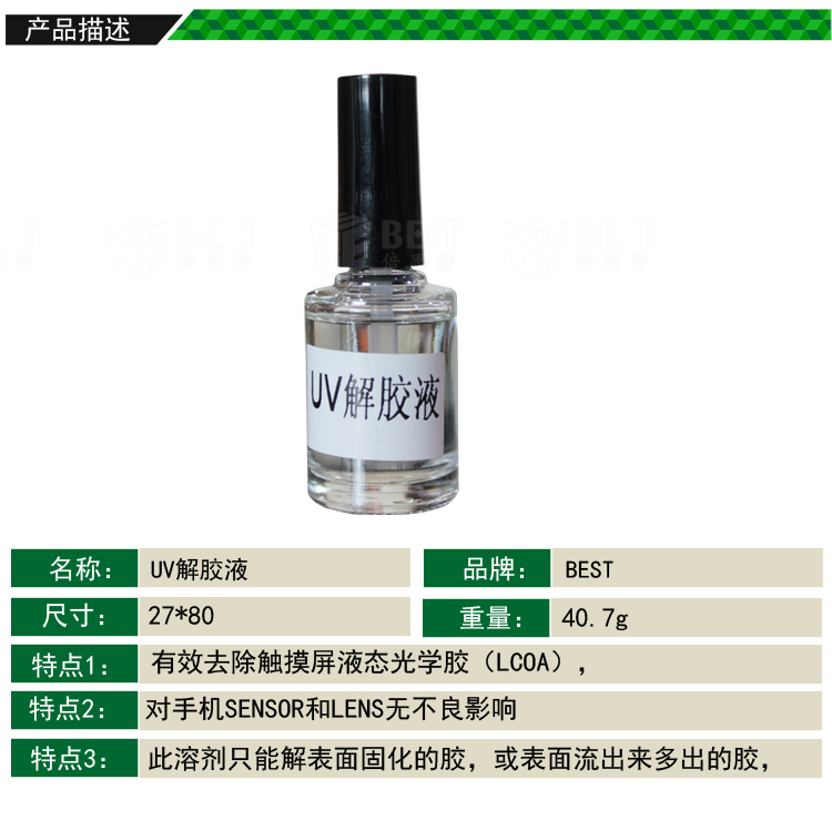 ? 产品名称: UV解胶液? 产品品牌: BEST? 产品类别: 清洁剂辅料系列