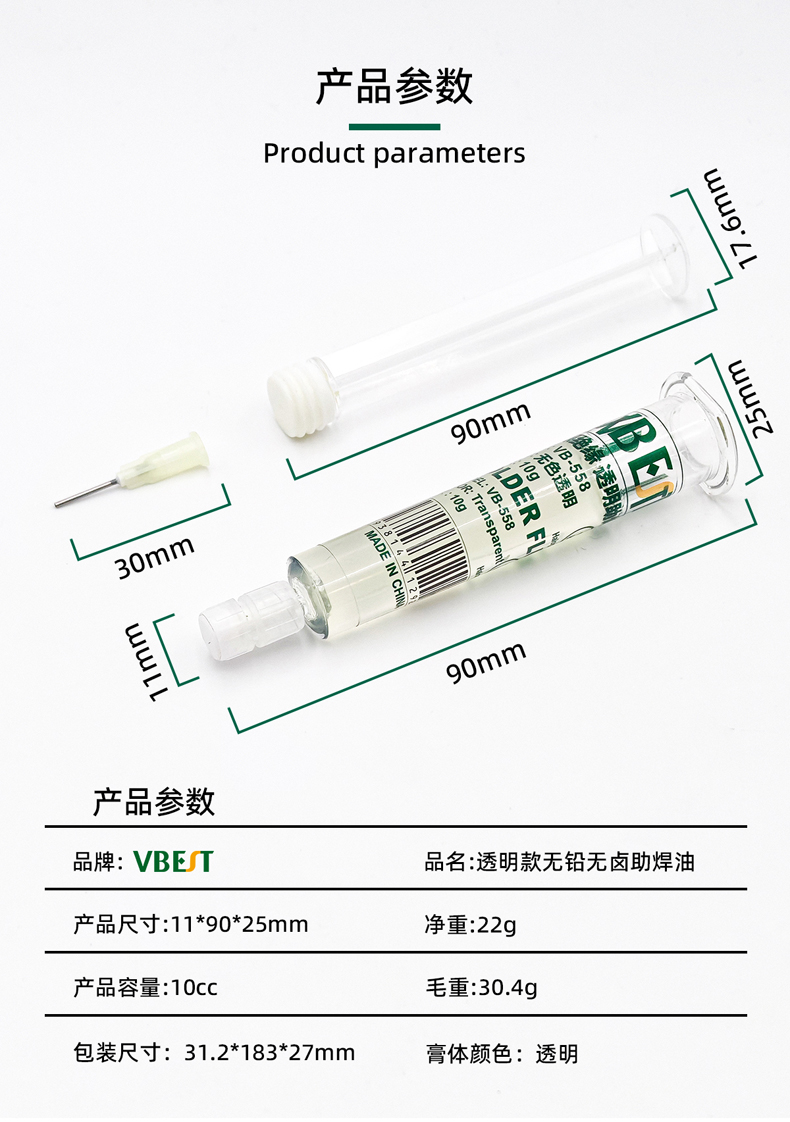 返回当前位置: 首页 / 产品中心 / VB-558 环保绝缘透明助焊膏 针筒式电子元器件焊接助焊膏 免清洗手机维修透明焊油10g