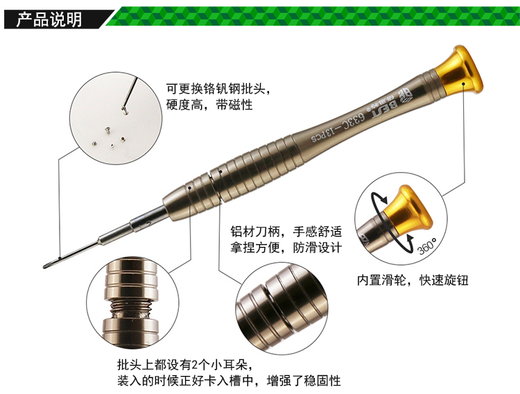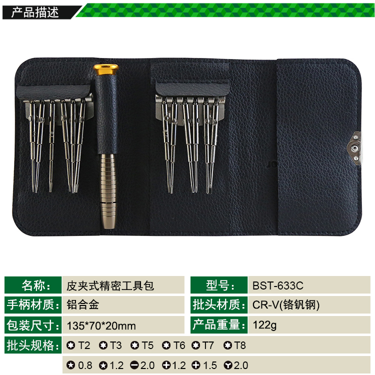 ? 产品名称: 皮夹式精密工具包 13pcs? 产品型号: BST-633C? 产品类别: 螺丝批系列