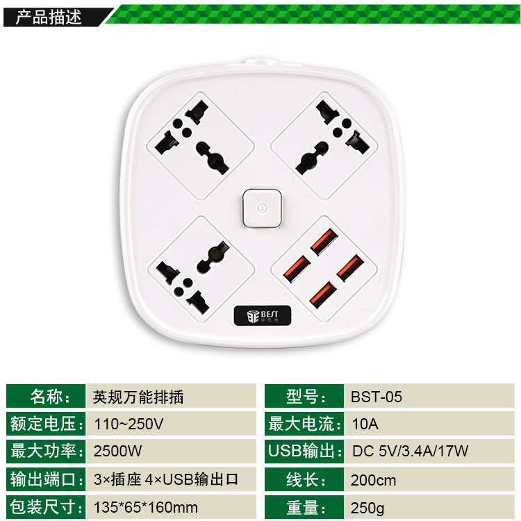 ? 产品名称: 英规万能排插? 产品型号: BST-05? 产品类别: 插座系列