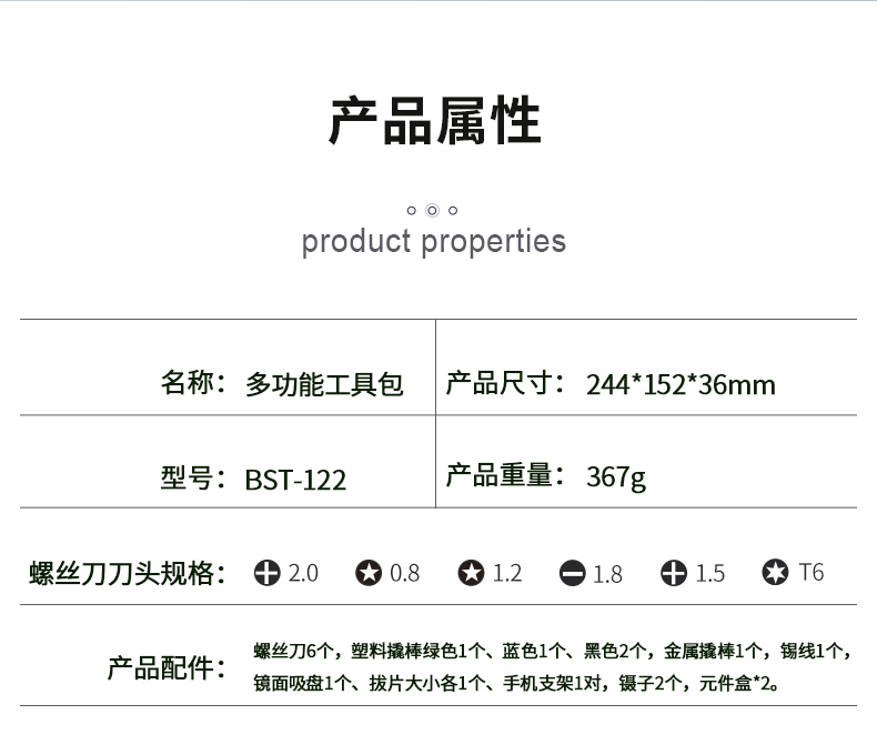 ? 产品名称: 多功能手机拆机工具包? 产品型号: BST-122? 产品类别: 拆机工具系列