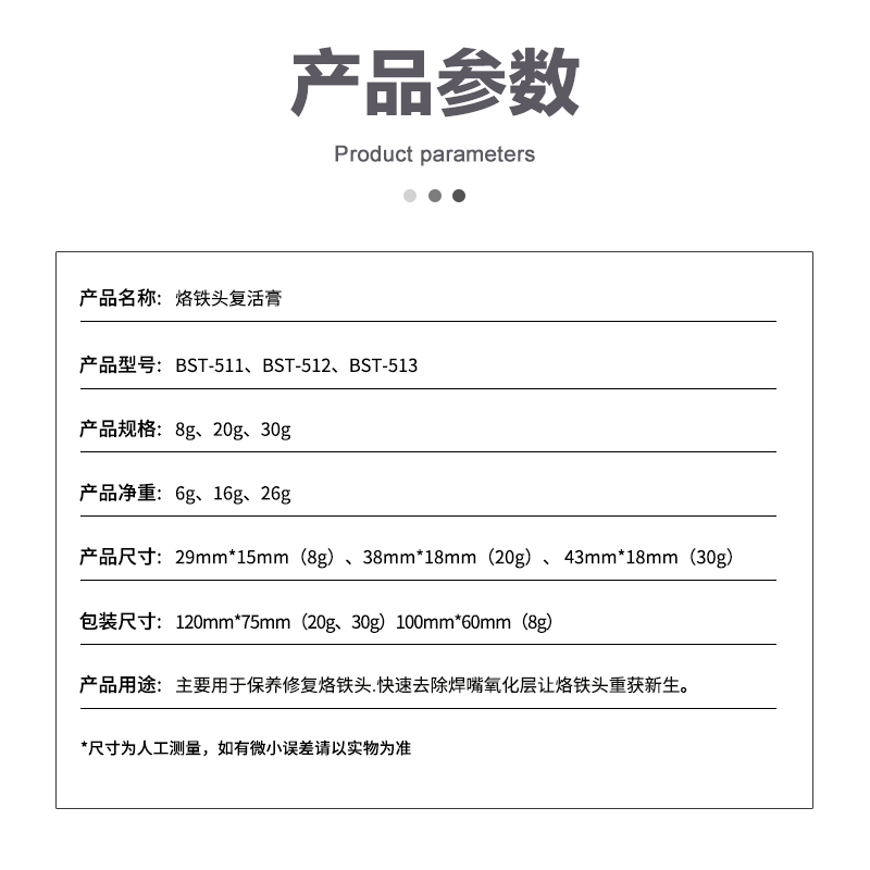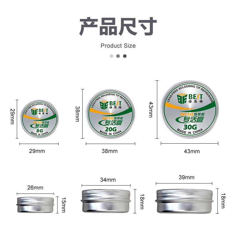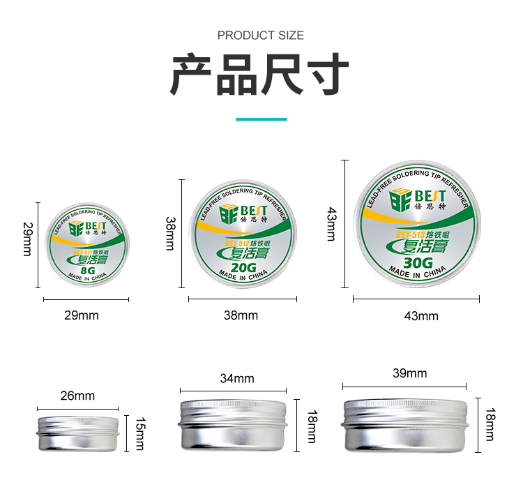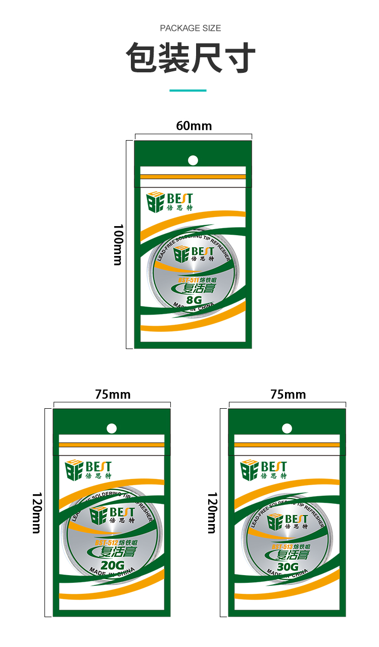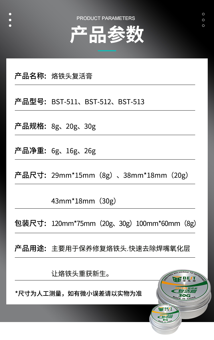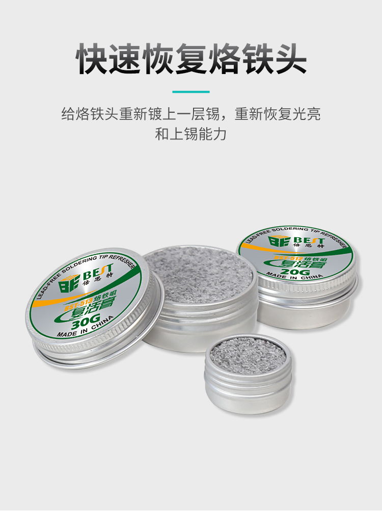 ? 产品名称: 烙铁头复活膏? 产品型号: BST-511/512/513? 产品类别: 锡浆焊油系列? 产品成分: 锡粉+磷酸盐? 产品重量: 8g/20g/30g