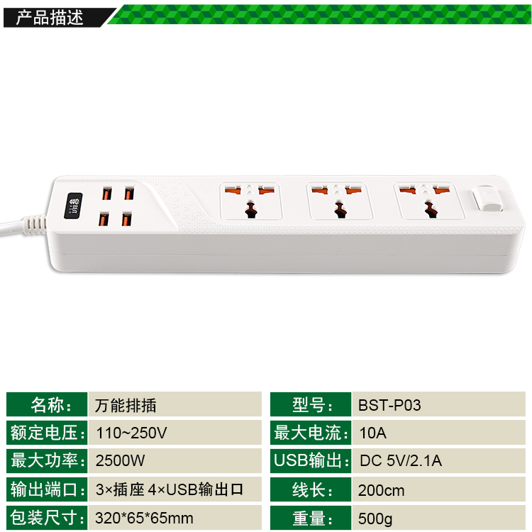 ? 产品名称: 万能排插? 产品型号: BST-P03? 产品类别: 插座系列