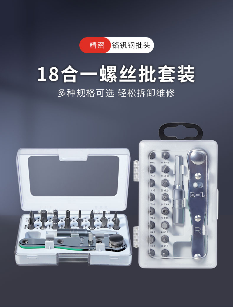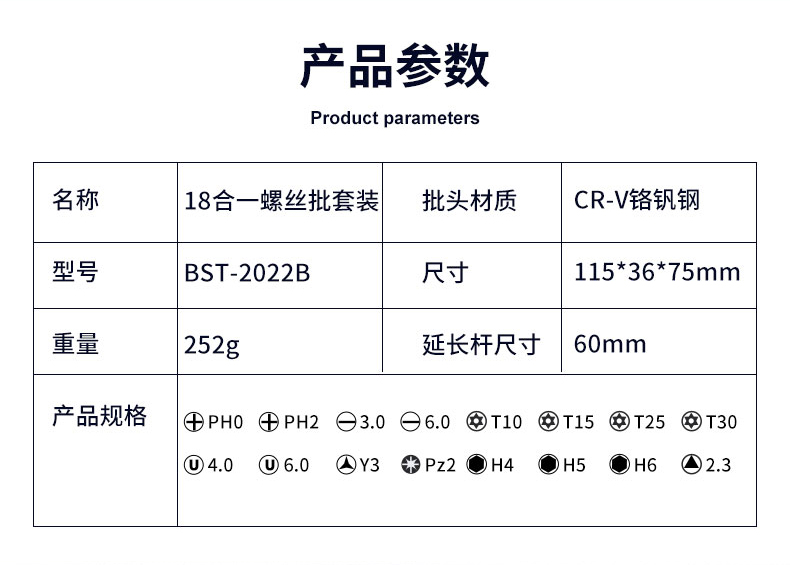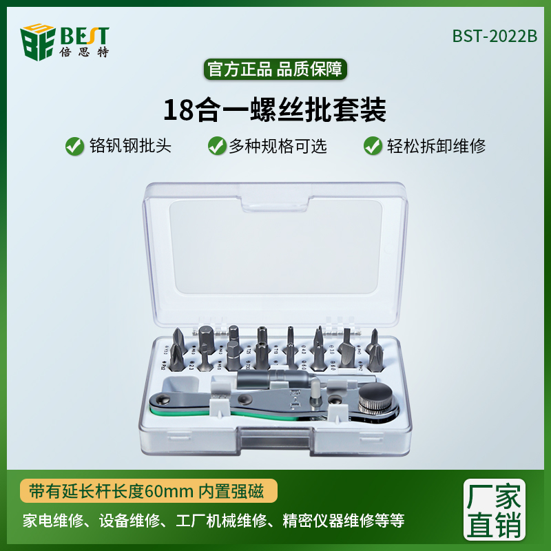 ? 产品名称: 双向棘轮18合一螺丝批套装? 产品型号: BST-2022B? 产品类别: 套批系列
