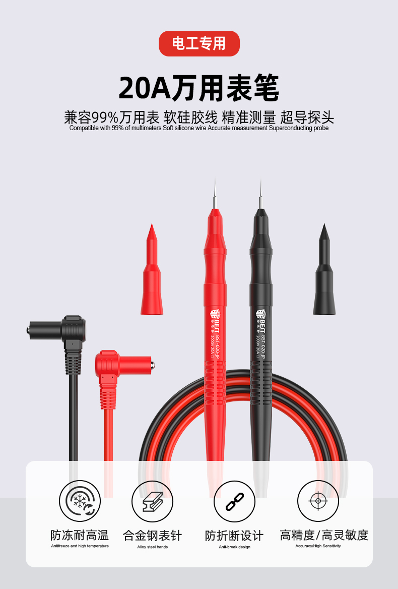 返回当前位置: 首页 / 产品中心 / BST-020-JP 超导细尖表笔 万用表表笔线 特尖钢针 防烫防冻硅胶线 2000V20A大电流