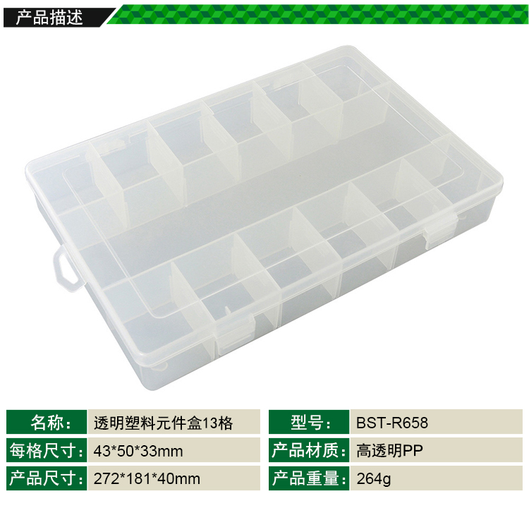 ? 产品名称: 13格透明塑料元件盒? 产品型号: BST-R658? 产品类别: 元件盒系列