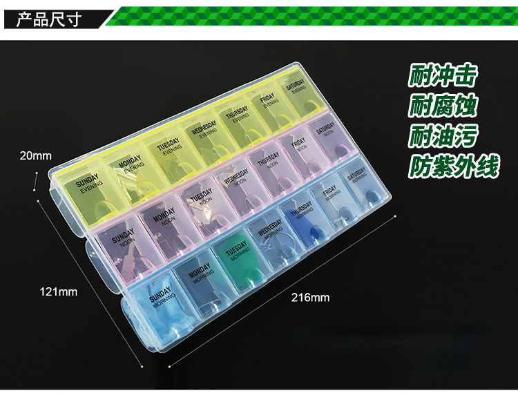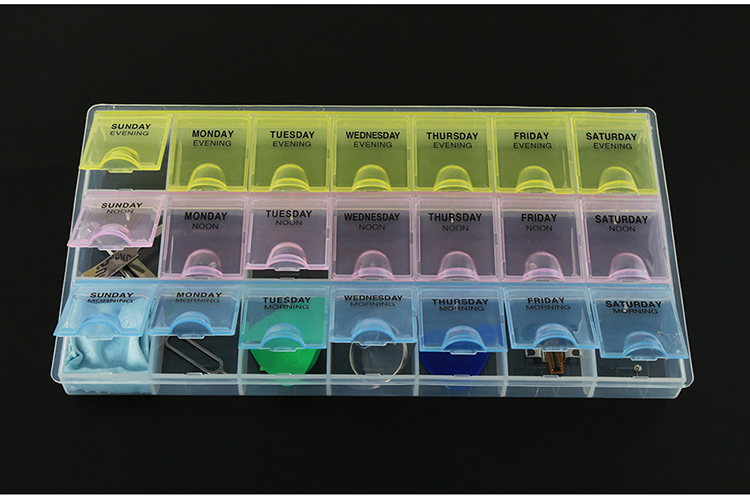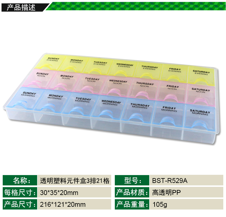 ? 产品名称: 3排7格星期透明塑料元件盒? 产品型号: BST-R529A? 产品类别: 元件盒系列