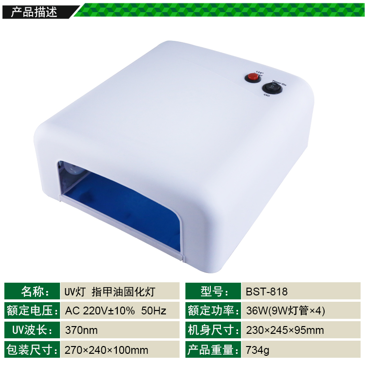 ? 产品名称: UV灯 无影胶指甲油固化灯? 产品型号: BST-818? 产品类别: 紫外灯系列