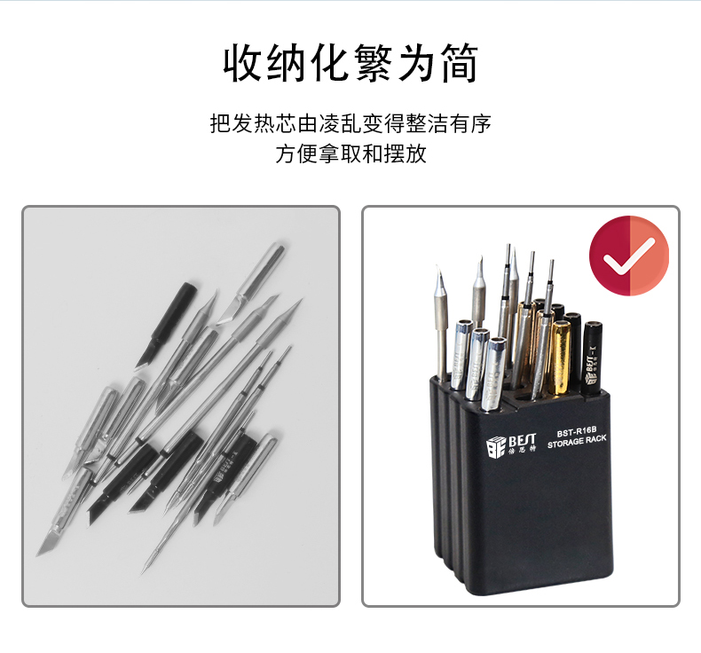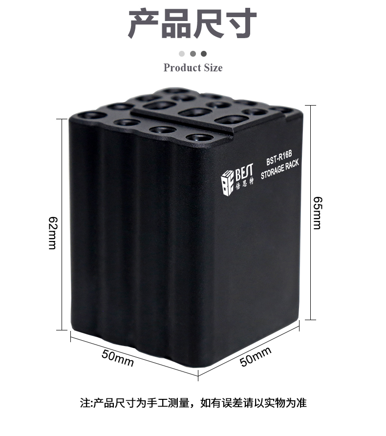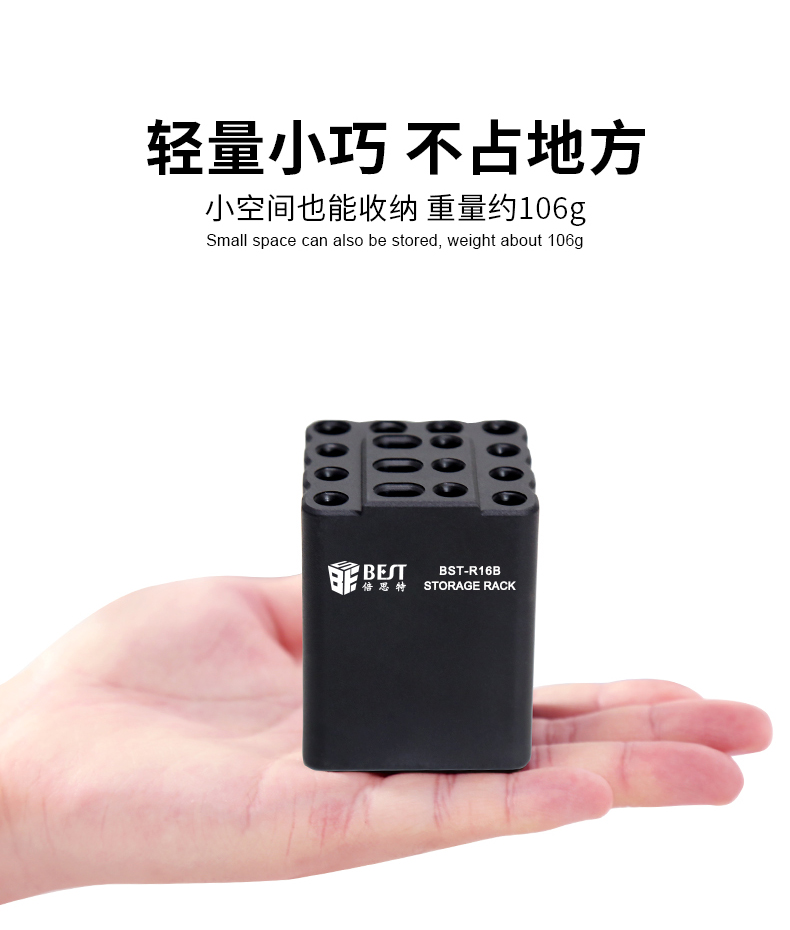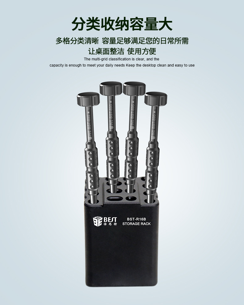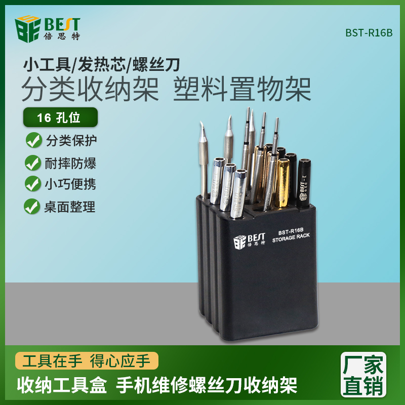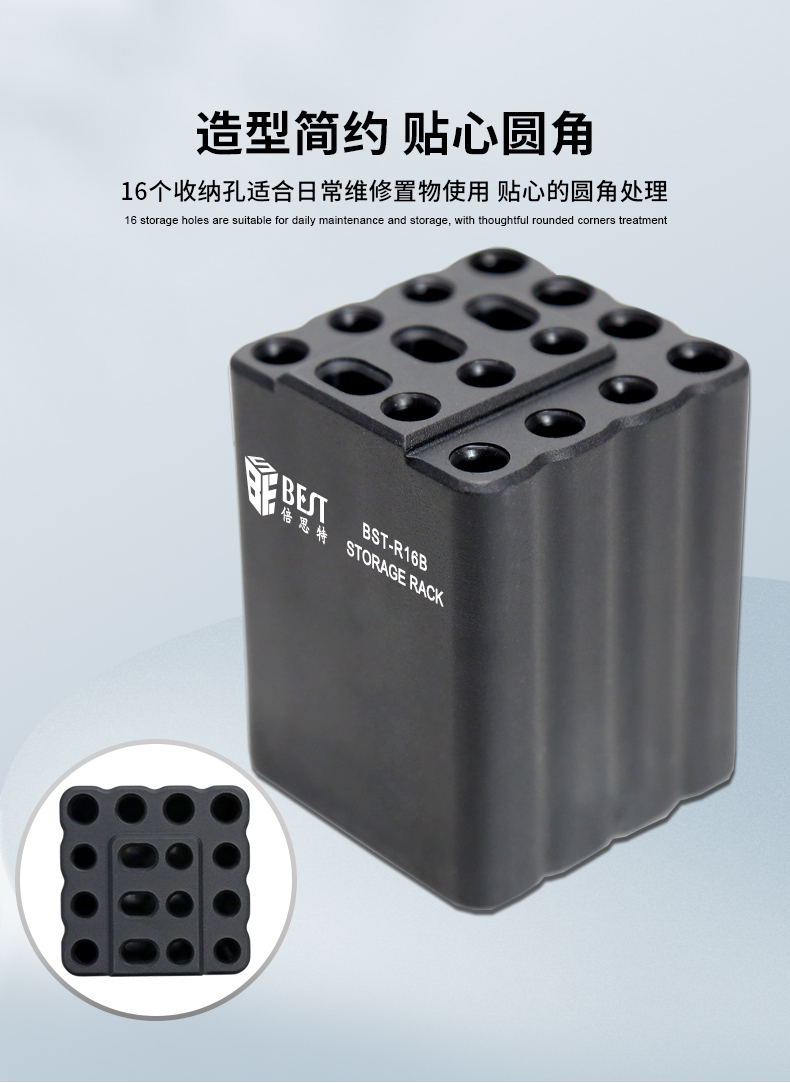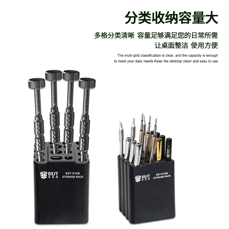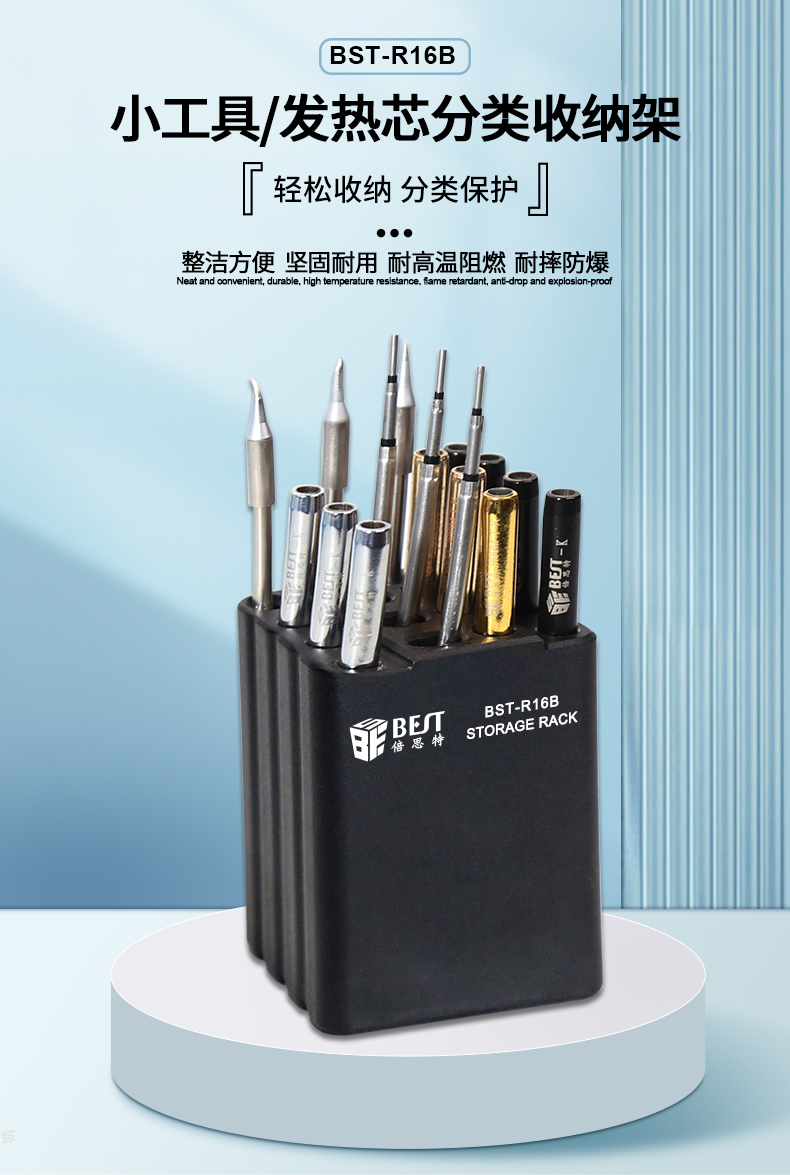 返回当前位置: 首页 / 产品中心 / BST-R16B 小工具发热芯螺丝刀分类收纳架 16个孔位分类摆放 拿取方便 耐高温阻燃防摔防爆 烙铁头收纳盒 塑料置物架