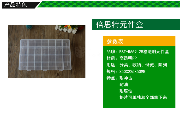 ? 产品名称: 28格透明塑料元件盒? 产品型号: BST-R659? 产品类别: 元件盒系列