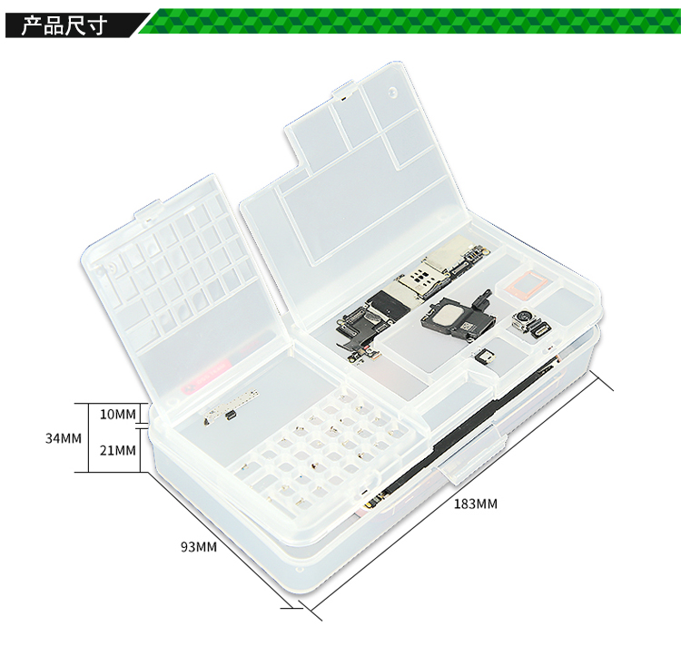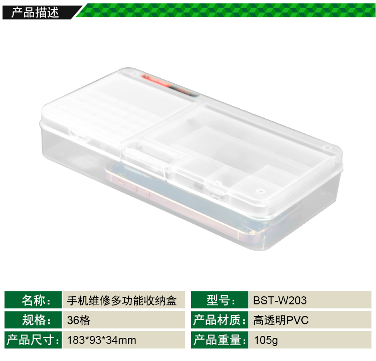 ? 产品名称: 手机维修多功能收纳盒? 产品型号: BST-W203? 产品类别: 元件盒系列