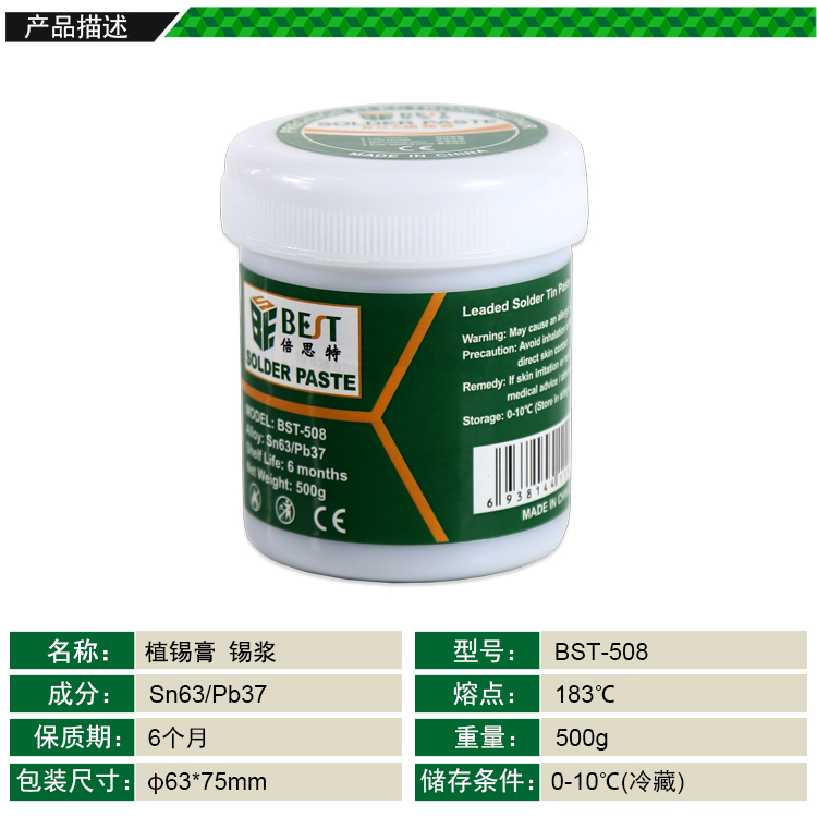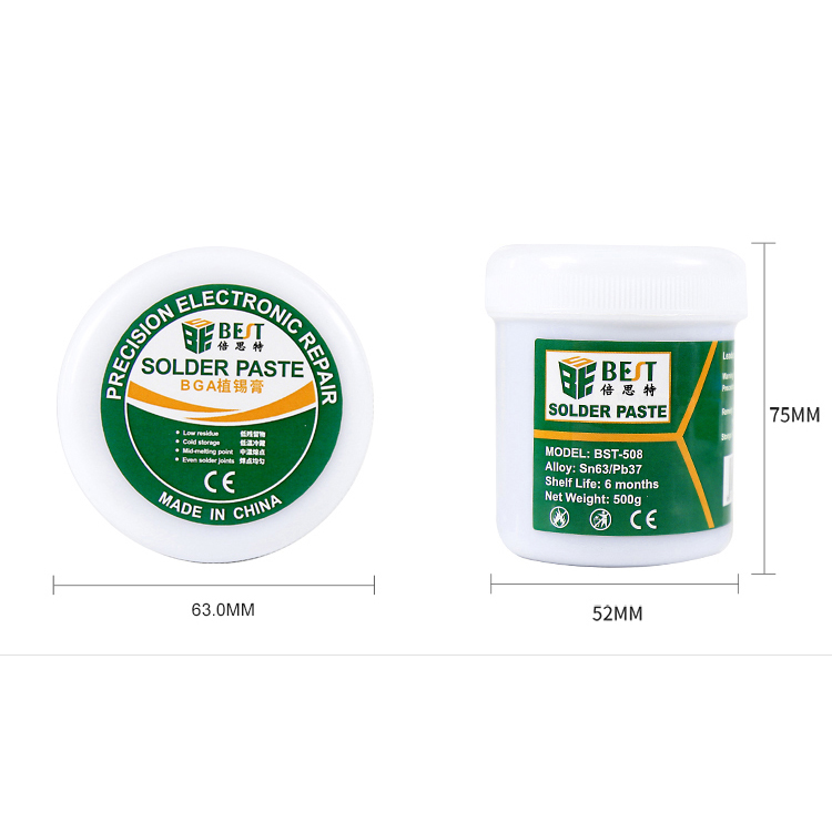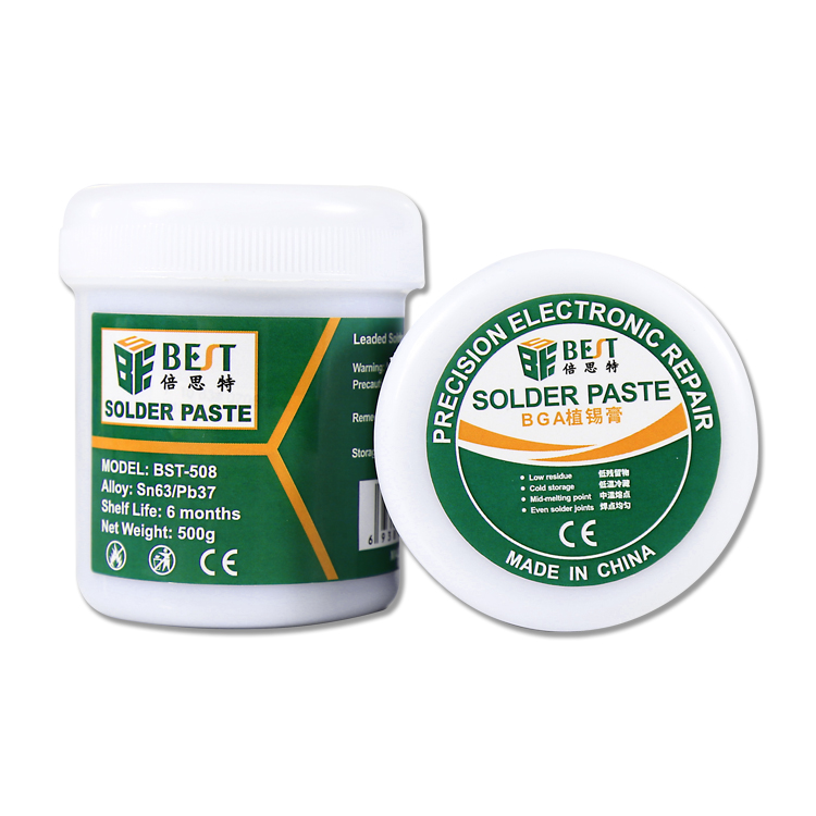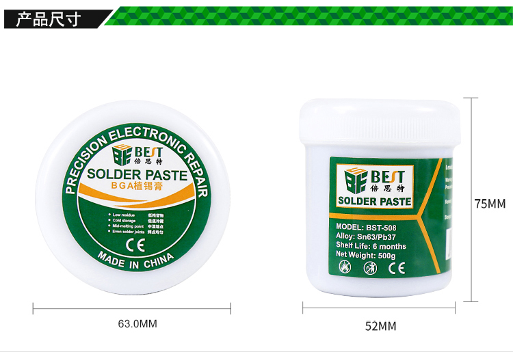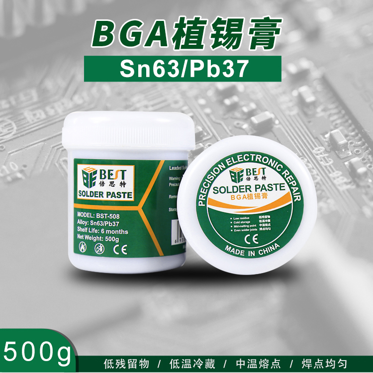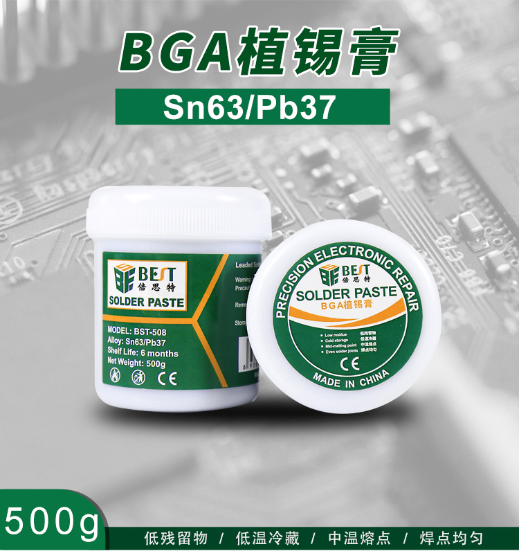? 产品名称: 锡浆 BGA植锡膏 500g? 产品型号: BST-508? 产品类别: 锡浆焊油系列? 产品成分: Sn63/Pb37? 产品重量: 500g
