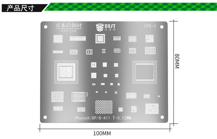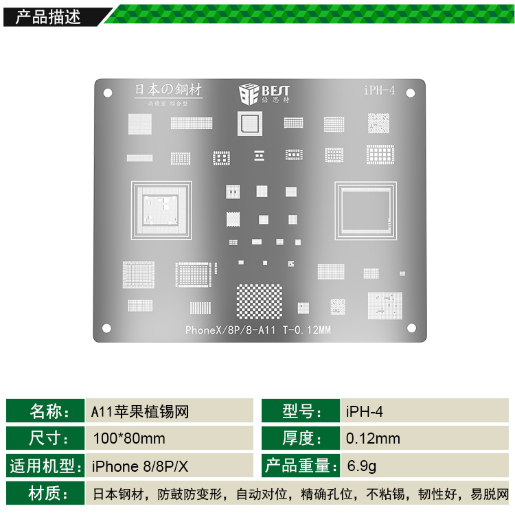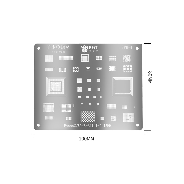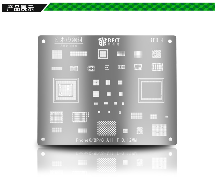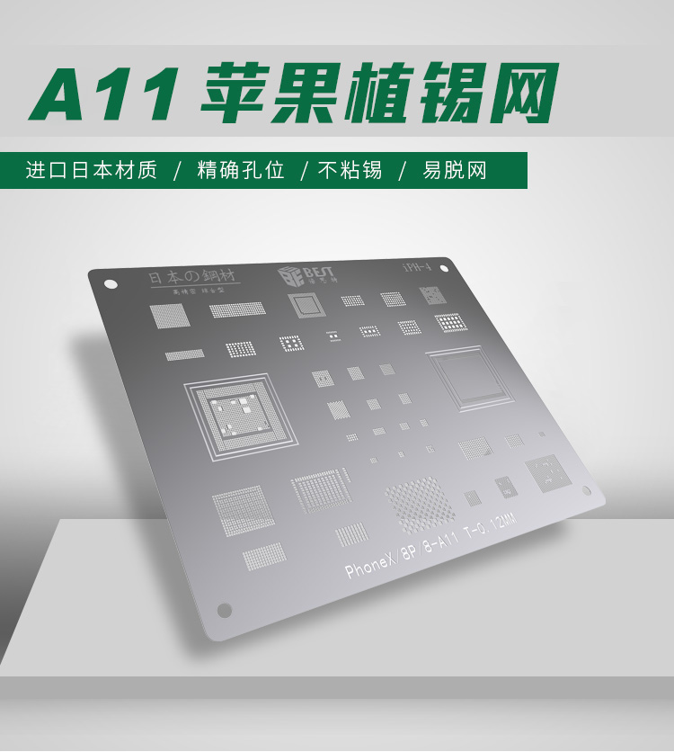 ? 产品名称: iPhone X/8/8P-A11 BGA植锡网? 产品型号: iPH-4? 产品类别: 植锡网系列