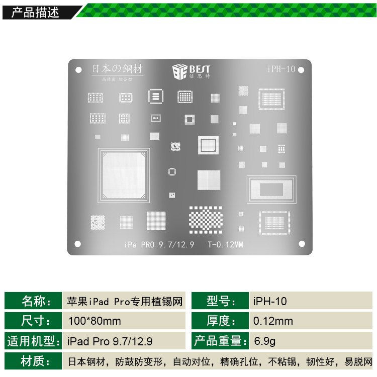 ? 产品名称: iPad Pro专用植锡网? 产品型号: iPH-10? 产品类别: 植锡网系列
