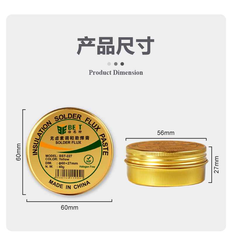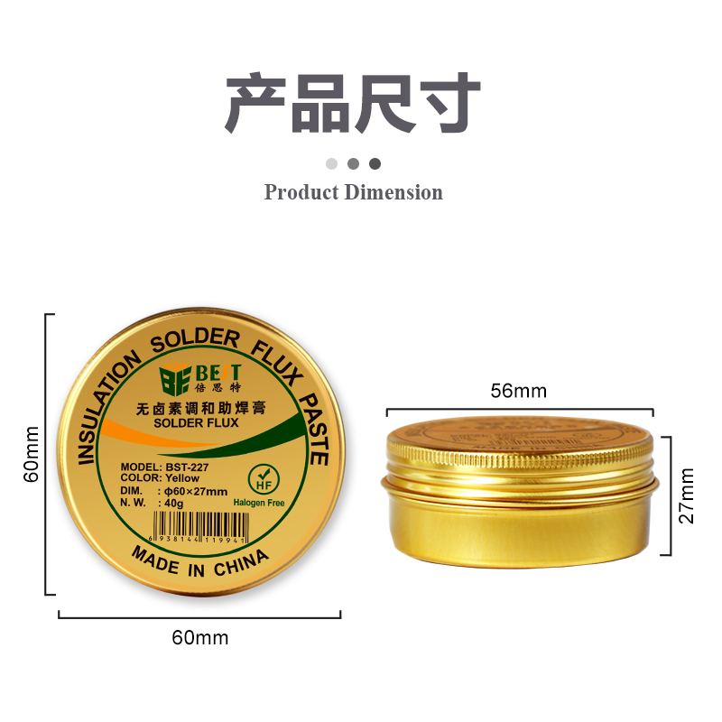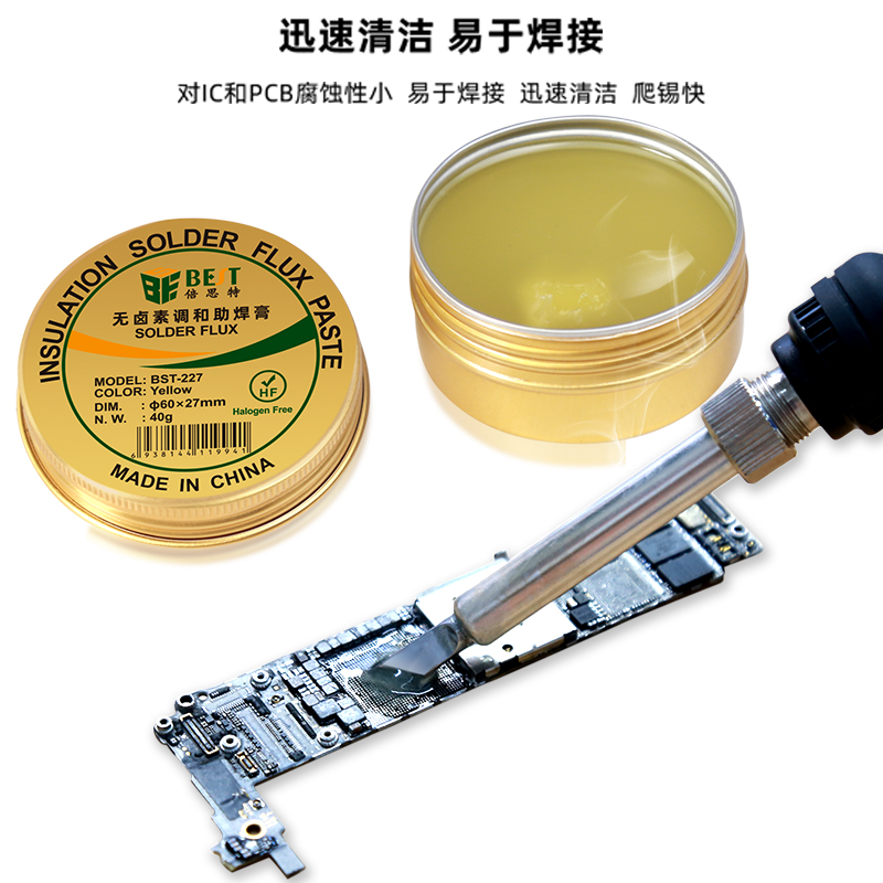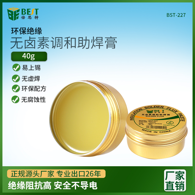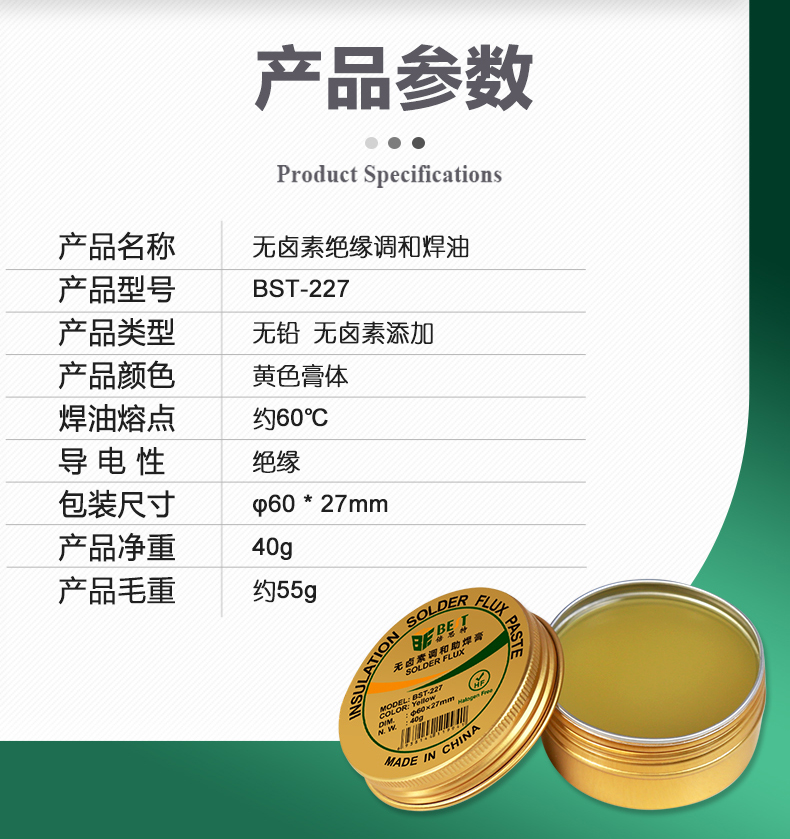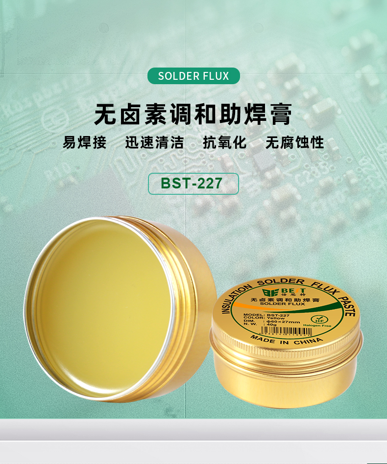 ? 产品名称: 无卤素调和助焊膏? 产品型号: BST-227? 产品类别: 锡浆焊油系列? 净含量: 40g