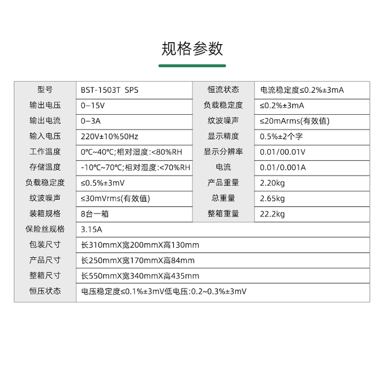 ? 产品名称: 线性直流稳压电源? 产品型号: BST-1503T SPS? 产品类别: 直流电源系列