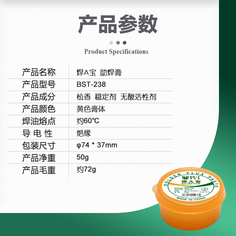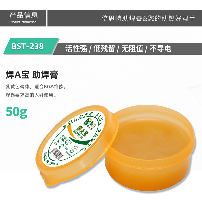 ? 产品名称: 焊A宝50g 助焊膏? 产品型号: BST-238? 产品类别: 锡浆焊油系列