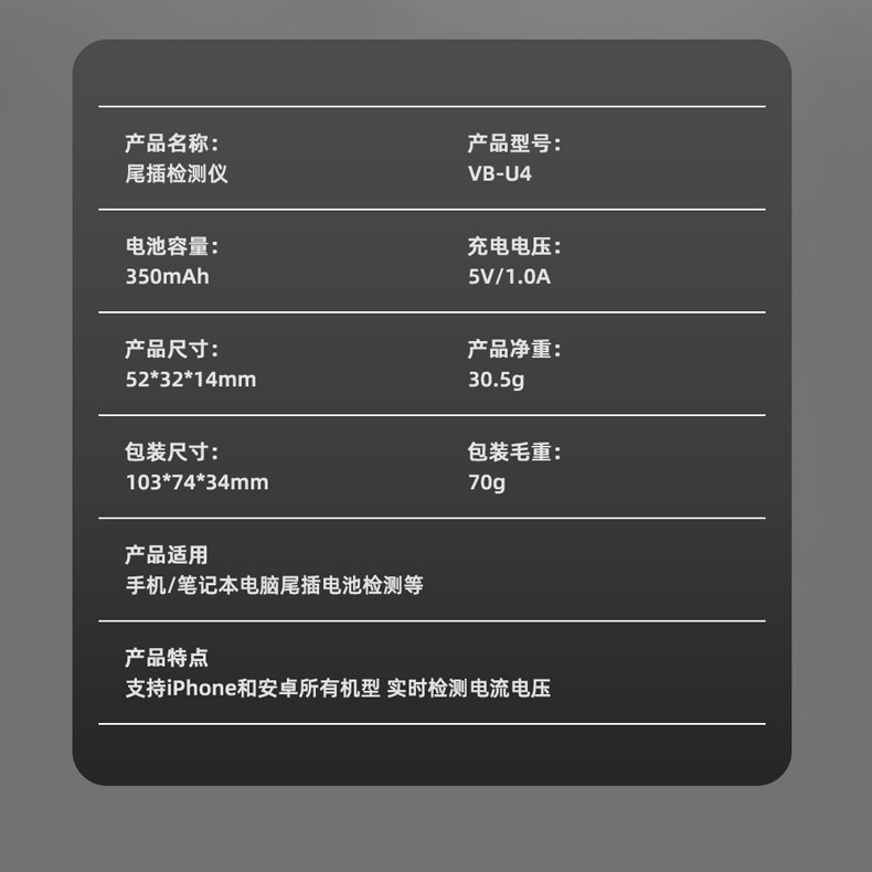 ? 产品名称: 尾插检测仪? 产品型号: VB-U4? 产品类别: 检测仪系列